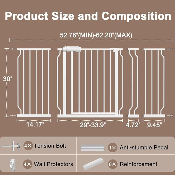 WAOWAO Baby Gate 52.76-62.2" Extra Wide Pressure Mounted Walk Through Swing Auto Close Safety White Metal Toddler Kids Child Dog Pet Puppy for Stairs,Doorways,Kitchen