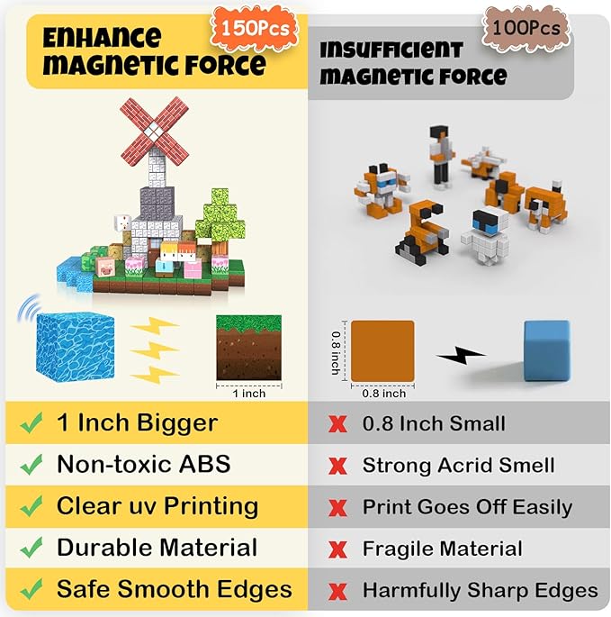 - 💪𝐌𝐚𝐠𝐧𝐞𝐭𝐬 𝐟𝐨𝐫 𝐁𝐢𝐠𝐠𝐞𝐫, 𝐌𝐨𝐫𝐞 𝐒𝐭𝐚𝐛𝐥𝐞 𝐂𝐫𝐞𝐚𝐭𝐢𝐨𝐧𝐬 - Our upgraded magnetic blocks include that securely lock the pieces together, enabling your child to build more complex, stable, and taller structures🏗️. Each block is carefully crafted from premium, eco-friendly materials, providing durability and endless hours of play without the frustration of collapsed creations.