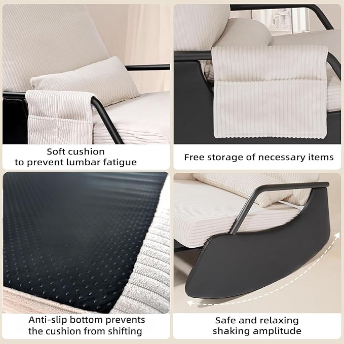 - Premium Weight Capacity & Comfortable Fabric and Padding: The nursery rocking chair is made with ultra-comfortable corduroy fabric and filled with memory foam for a double layer of relaxation for both your skin and body. The base is also equipped with anti-slip material to prevent sliding