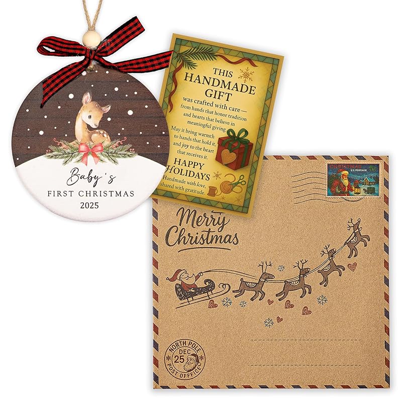 - 🎄 Baby's First Christmas Ornament 2025 – A Sweet First Holiday Keepsake Celebrate the magical milestone with this Baby's First Christmas Ornament 2025, crafted from premium wood and designed with a charming baby deer, snowy background, and festive greenery. A perfect way to mark the first holiday season on your My First Christmas Tree, this ornament is ideal for both boys and girls. It's a heartwarming keepsake your family will treasure forever.