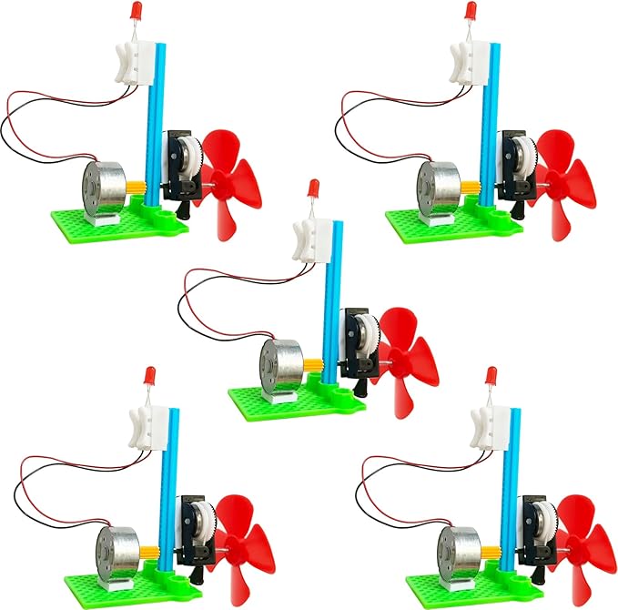 Each kit features a DC motor, fan blade, LED light bulb, and simple connection components.