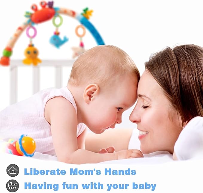 • Carseat toys for infants 3-6 months,Stroller toys have variety of graphics,cloud with a bell.BB squeaker in the crab,press to make a Bi~ Bi~ sound.Fish has colorful rotating ball.