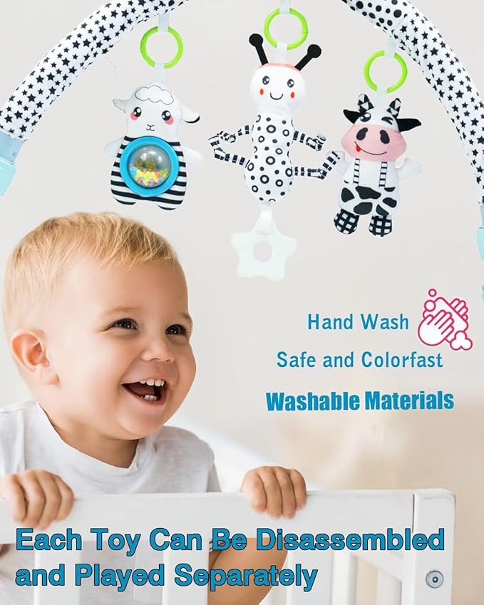 Carseat toys for infants 3-6 months,Stroller toys have variety of graphics,ant with a bell.BB squeaker in the cattle,press to make a Bi~ Bi~ sound.Sheep has colorful rotating ball.