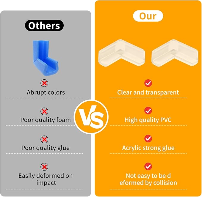 - Transparent and Clear: Corner Protector Baby The transparent and flawless design makes the table corner protectors almost visually integrated with the furniture, without harming the original aesthetics of the furniture. Baby corner protector guards make family members feel more naturally comfortable in their daily lives.