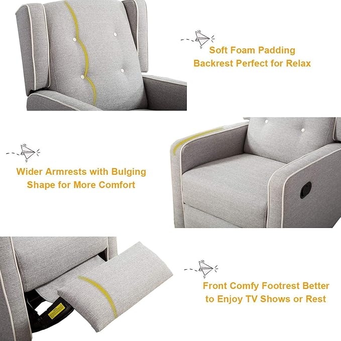 - High Backrest and Cozy Armrest - On the basis of fully relax your arms and body, this manual swivel rocker gliding chair is composed of upholstery button & track arm & a foam soft cushion & butterfly back.