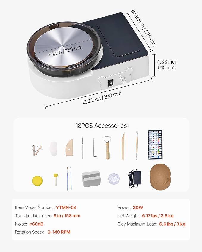 - Mini Pottery Wheel: This mini pottery wheel for kids and adults features a powerful 30W motor and a 6 in aluminum alloy turntable. Durable and stable, it supports up to 6.6 lbs of clay—ideal for different ages to explore ceramic creativity