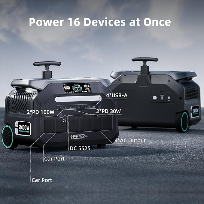 - 【Power for Home and Outdoor Adventures】With 2048Wh capacity and 2400W rated output, this station can power up to 99% of your devices through multiple ports: 4 AC outlets, 4 USB-A ports (30W), 2 fast-charging USB-C ports (100W), 2 standard USB-C ports (30W), 2 DC outlets, and 1 car cigarette lighter port. It’s a reliable solution for home use, outdoor activities, RV life, DIY projects, or job sites—compatible with phones, laptops, tools, kitchen appliances, car gear, and more.