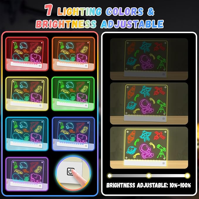 - 7 Colorful Light Modes - Choose from 7 glowing effects: red, orange, yellow, green, light blue, dark blue, and purple. Kids can switch colors freely to brighten their artwork and spark endless creativity
