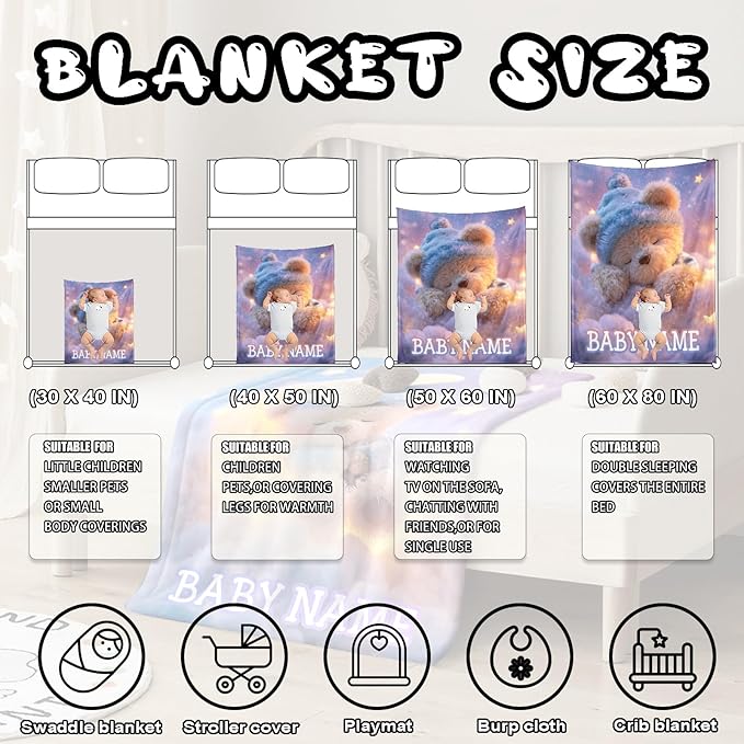 - Custom Baby Gifts Your Family Will Cherish -- Imagine the delight when parents unwrap this personalized baby blanket with name printed just for their little one. Ideal for newborns, toddlers, or kids, this blanket becomes a sentimental heirloom they’ll treasure. Click “Customize Now” and easily enter the name to create a unique custom baby blanket - the ultimate baby shower gift or birthday gift for baby girls or boys.