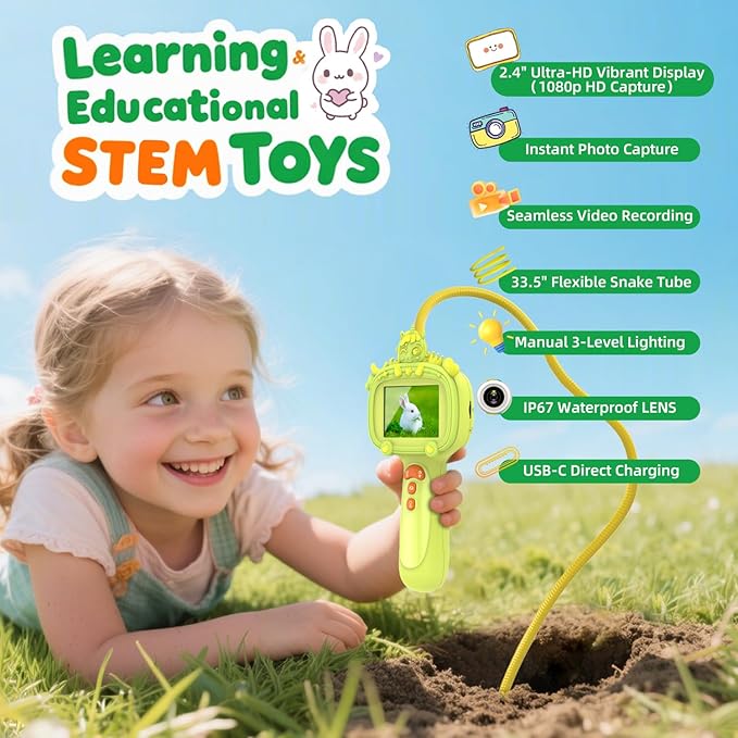 - IP67 Waterproof Adventures: Dive into aquatic fun with the snake camera with light’s IP67-rated tube, ideal for probing ponds, streams, or fish tanks in rainy settings. Kids aged 3-12 can discover submerged plants or fish safely, making this durable tool a top pick for all-weather outdoor exploration