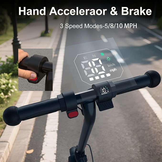 - ✨ Hand Accelerator & Brake: Caroma E6 electric scooter for kids features hand-operated acceleration and braking for safe, easy riding. Simply kick-start to 3 mph, then press and hold the throttle for smooth acceleration. The reliable dual-brake system ensures confident stopping power in any riding condition.