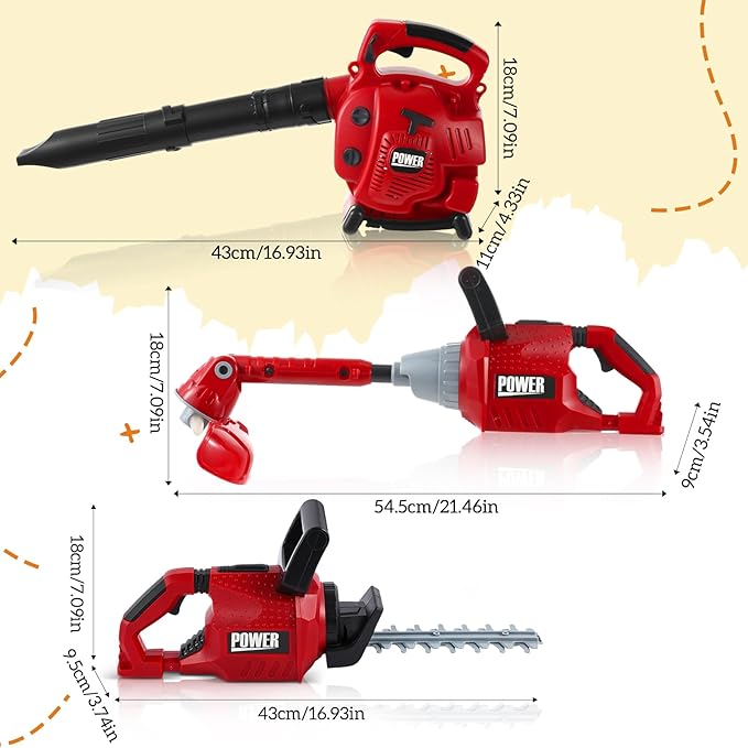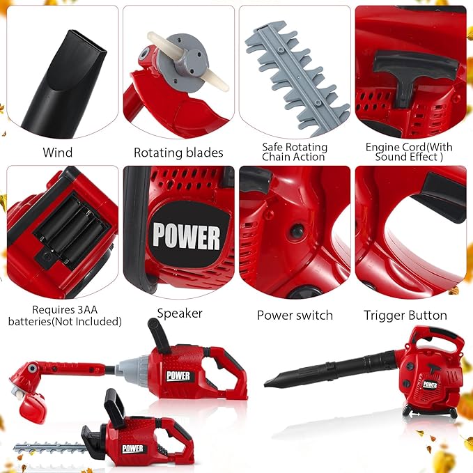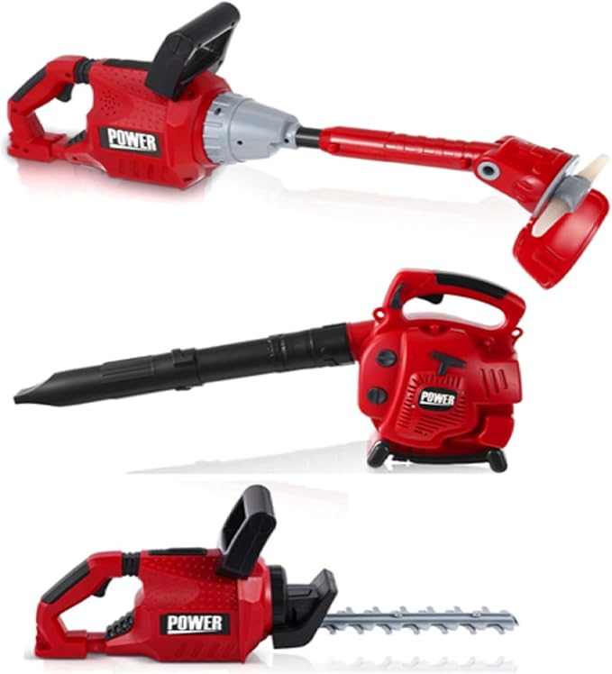 - Complete Play Tool Set for Kids: our kids lawn equipment toys set is a nice bundle to keep your child entertained and engaged; The set includes a fake leaf blower, a fake lawn trimmer line, and a fake hedge trimmer, all designed to match real world models; In bold red and black colors