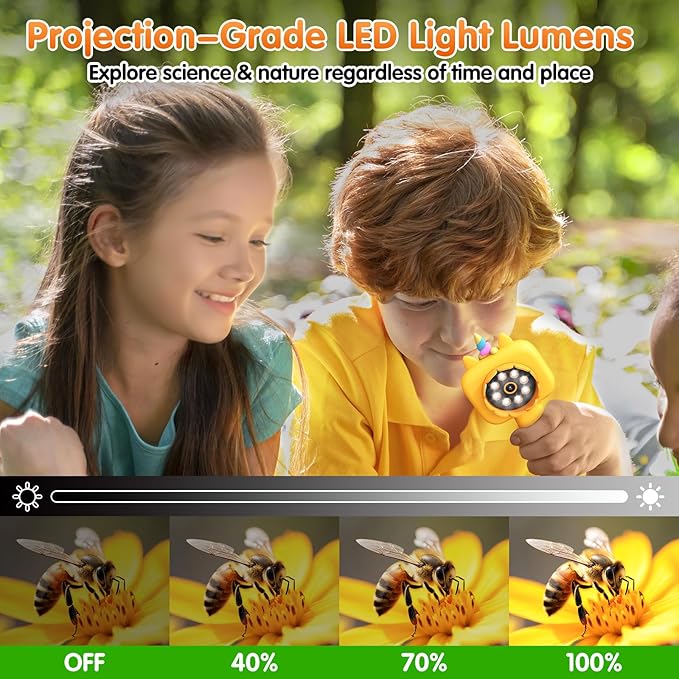 - 🔬【Projection-level lumen LED】8 LED lamp beads with 3 levels of adjustment provide projection-level lumen brightness, ensuring that the images and videos of the magnifying glass with light are clear and bright. Even in low light conditions outdoors at night, children can get the best observation effect, stimulating their curiosity and desire to explore.