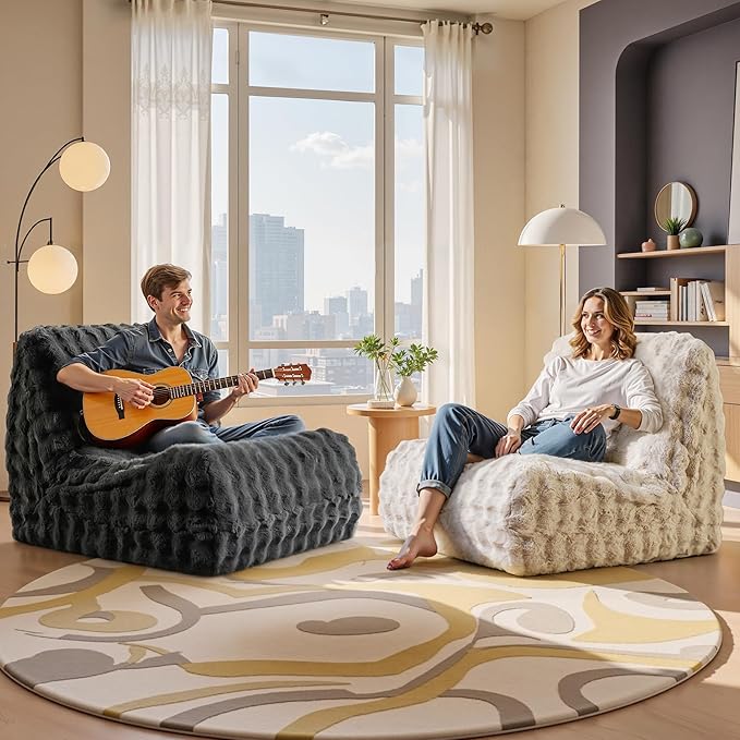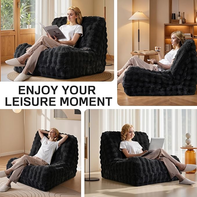 Modern Bean Bag Chair, Large Bean Bag Couch for Adults with Memory Foam Filled, Soft Faux Bunny Fur Lazy Chair for Living Room Bedroom Dorm Apartment, No Assembly Required, Dark Grey