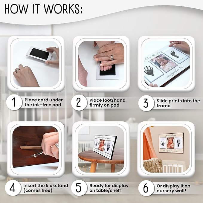 - NO HASSLE, NO MESS BABY KEEPSAKE - With lovely designs you can choose from, built-in acrylic cards to insert the prints to, a printed photo of your baby, no-mess inkpads for baby hand and footprints, this is the easiest way to capture your babyβs adorable prints forever. It comes with 4 print cards and 4 safe, no-mess ink pads, so you can try to get the perfect print more than once!
