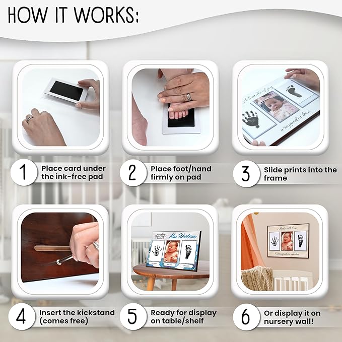 - NO HASSLE, NO MESS BABY KEEPSAKE - With lovely designs you can choose from, built-in acrylic cards to insert the prints to, a printed photo of your baby, no-mess inkpads for baby hand and footprints, this is the easiest way to capture your babyβs adorable prints forever. It comes with 4 print cards and 4 safe, no-mess ink pads, so you can try to get the perfect print more than once!