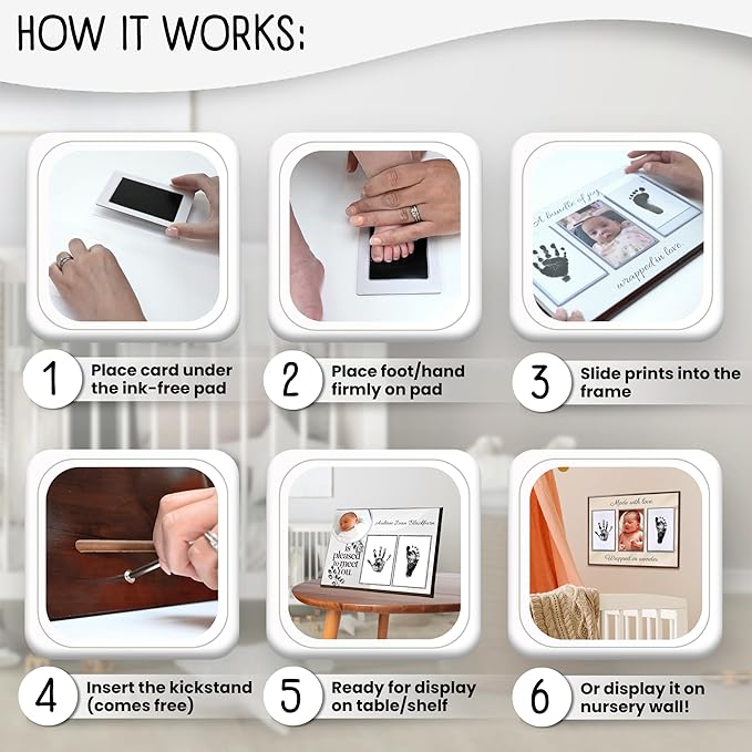 - NO HASSLE, NO MESS BABY KEEPSAKE - With lovely designs you can choose from, built-in acrylic cards to insert the prints to, a printed photo of your baby, no-mess inkpads for baby hand and footprints, this is the easiest way to capture your babyβs adorable prints forever. It comes with 4 print cards and 4 safe, no-mess ink pads, so you can try to get the perfect print more than once!