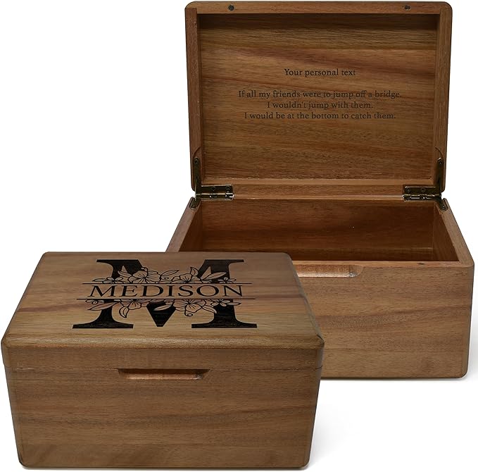 - Customizable: this acacia wooded keepsake box can be engraved with various designs offered create your own memory box by adding a name or family name to make it unique. We’ll use the font style showcased in the photos. Additionally, it can be engraved inside(different font options), on the other lid's side, to create a surprise message for the recipient